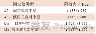 (1)附着力试验方法虽然多数已采用直接拉开法,但是直接拉开法也有多种试验方法和对应的仪器,对于一种涂料采用不同的测量方法和仪器,其测量的结果会有很大的不同,如目前在施工现场对涂料体系采用附着力试验的方法:ASTMD4541和便携式附着力测定仪,按目前标准规定的仪器有A1~A5共5种,有人采用其中4种仪器,分别对同一种涂料体系进行测定,发现结果有很大的差异,表2说明试验结果情况。