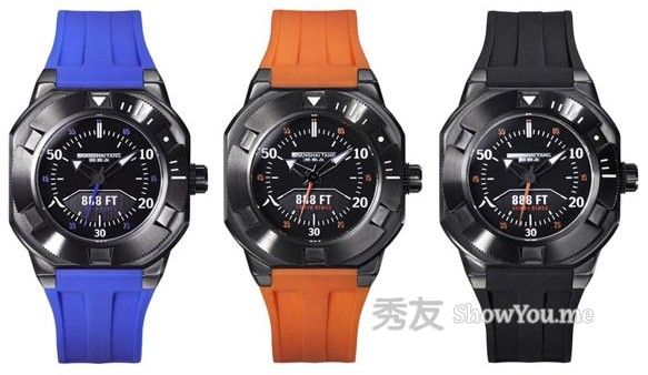 888潜水腕表备有多种颜色选择,包括以暗灰色配搭夺目的彩蓝或鲜橙色聚氨酯胶表带,亦有全黑款式。